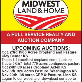 UPCOMING AUCTIONS:Oct. 23rd 1500 Acres Cropland and Pasture. Clay Center KSTracts 1-4 excellent cropland some pastureTracts 5,6&7 total 775 acres contiguous pastureOct 24th 80 acres Cropland Axtell KSNov 6th 320 acres Pasture. Washington KSNov 20th 135 acres CRP & Pasture. Linn KSLogon to our website or download our app to stay up to date on